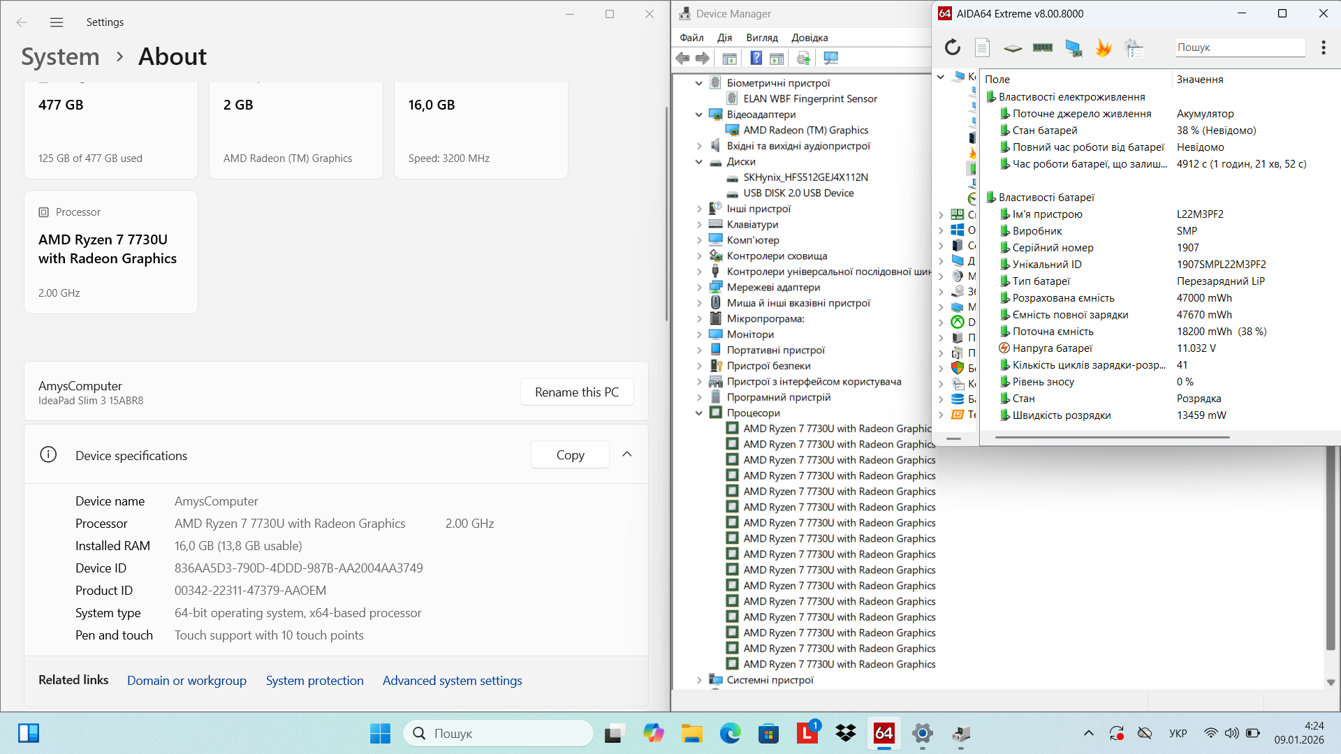 ✔ Процесор: AMD Ryzen 7 7730U (2.0–4.5GHz, 8C / 16T)
